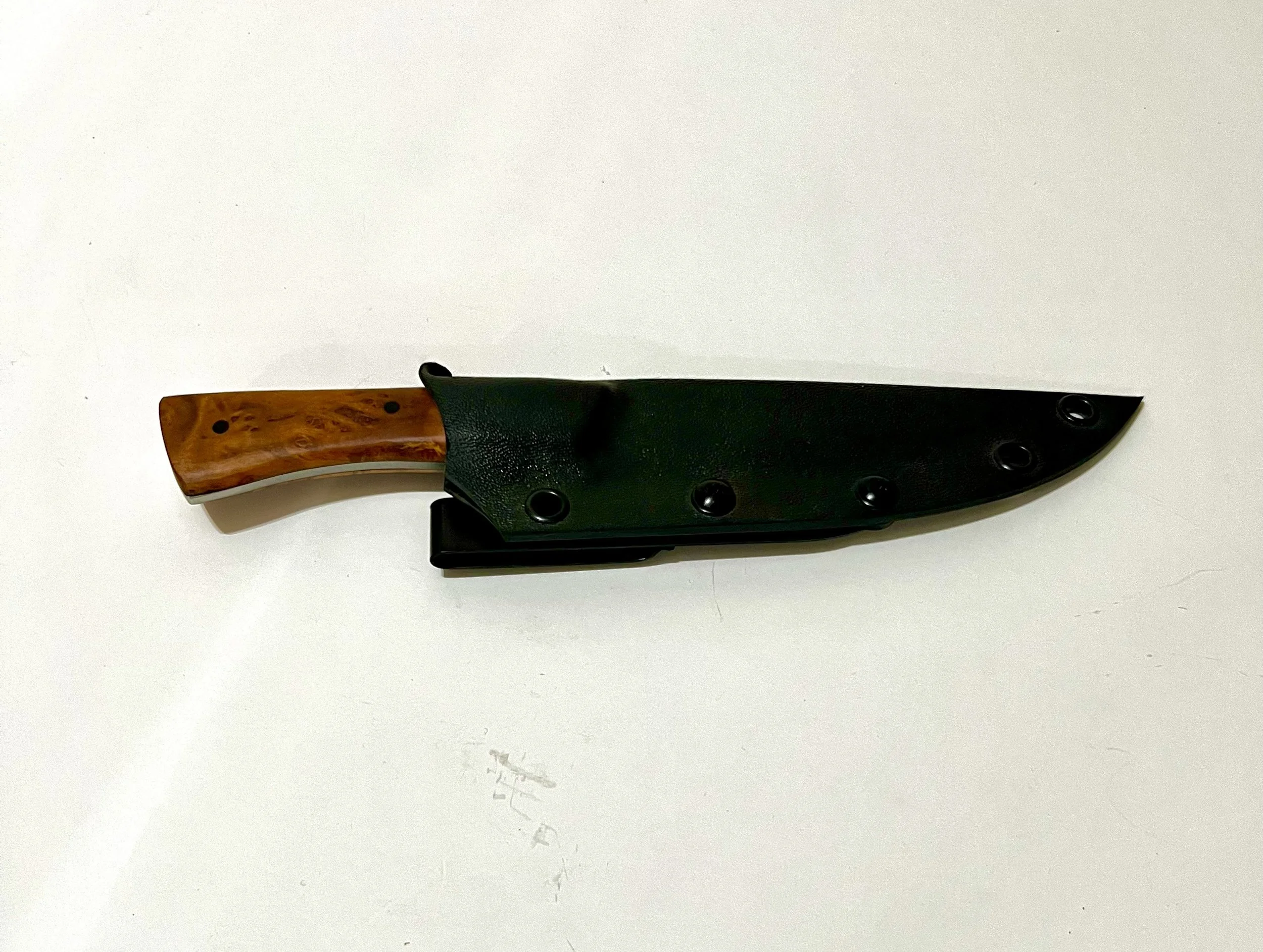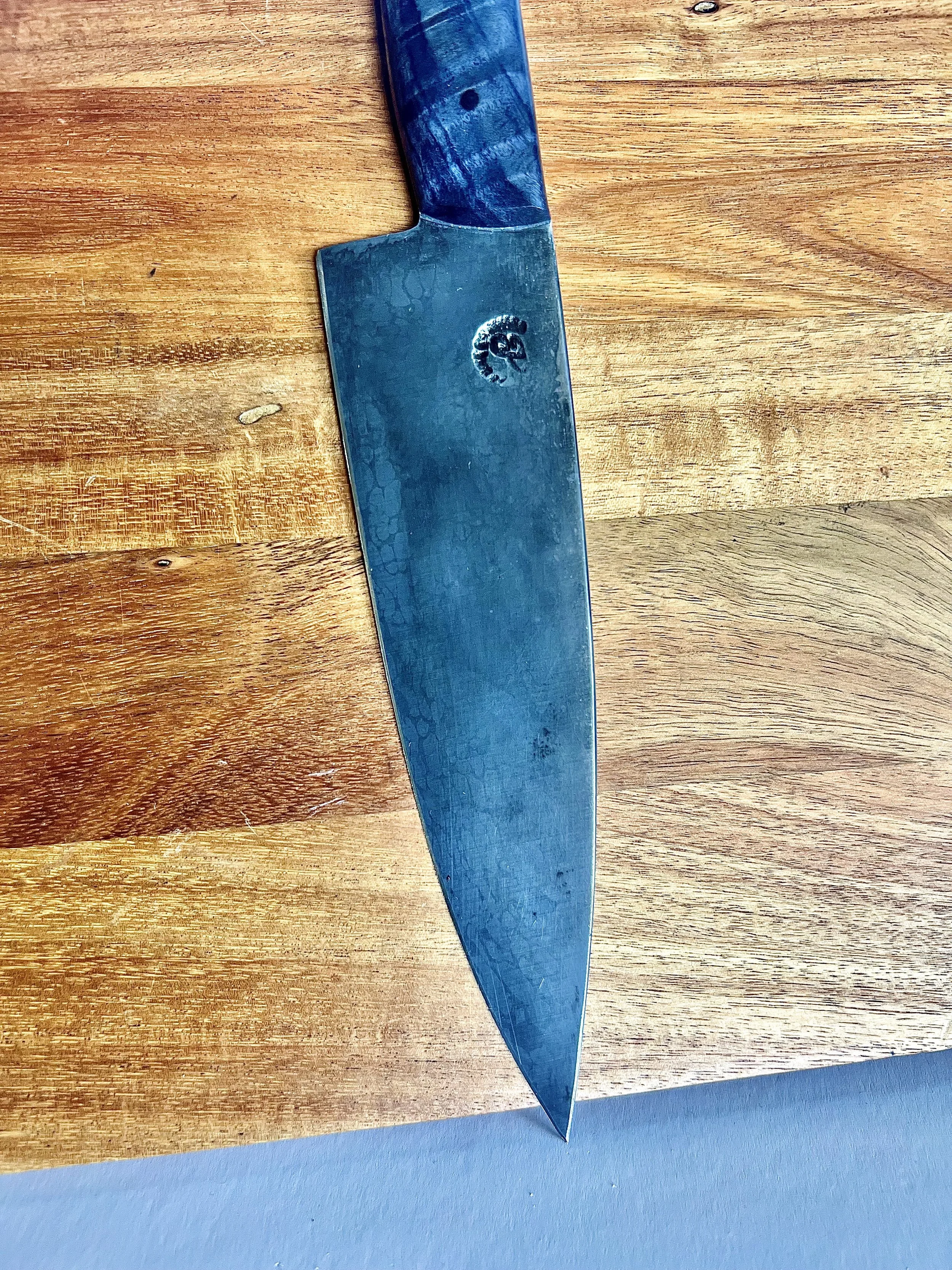 High carbon knives are very durable. Designed to hold and edge longer and last for generations with proper care. HC knives will rust with prolonged exposure to moisture. To clean, hand wash and dry off water. Periodically use a food safe wax or oil to protect your knife from the elements